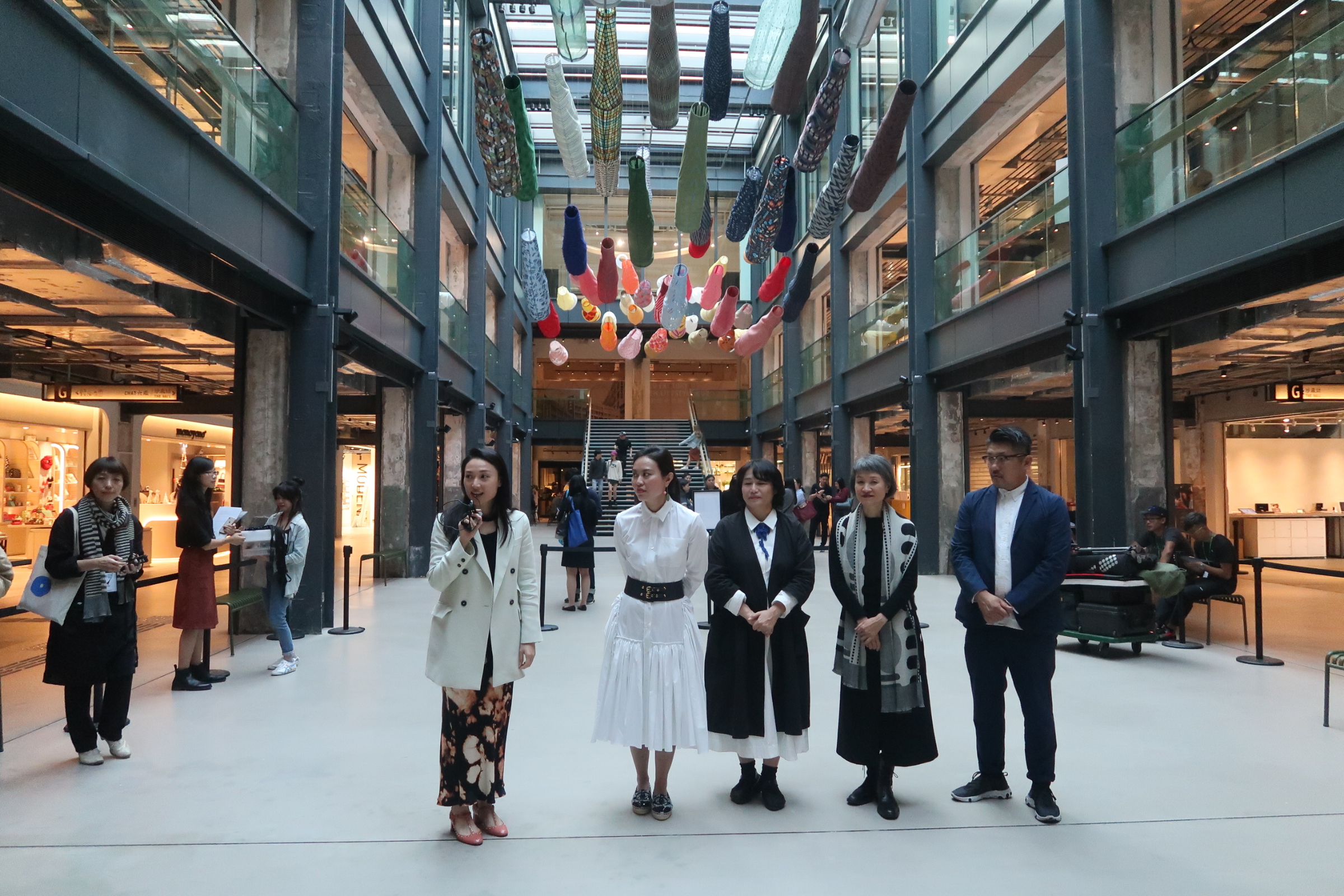 須藤玲子(右二)與展覽團隊在南豐紗廠向記者介紹其個展。80多條由須藤的布料製成的鯉魚旗浮游於空中。