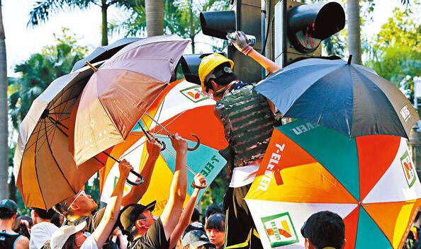 黑衣暴徒在其他暴徒举伞掩护下破坏交通灯。(图源:文汇报)