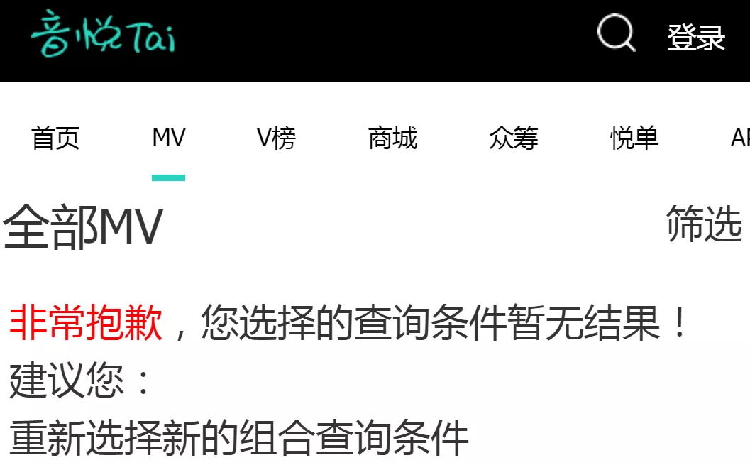 如今打开音悦台网站,首页显示的MV均已无法播放。查看其全部MV列表,显示“没有内容”。