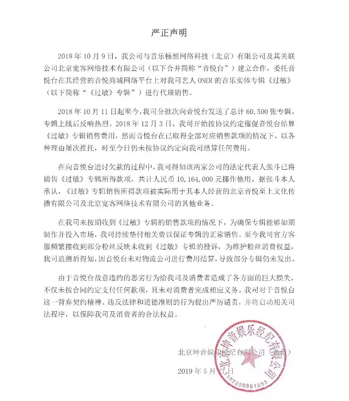 今年5月27日晚,北京坤音娱乐经纪有限公司(简称“坤音娱乐”)发布声明称,坤音娱乐委托音悦台在其经营的线上商城中代理销售该公司艺人的专辑,自2018年10月11日起陆续发送共计60500张专辑,在音悦台已经取得全部对应销售款项的情况下,坤音娱乐至今未收到任何结算费用。