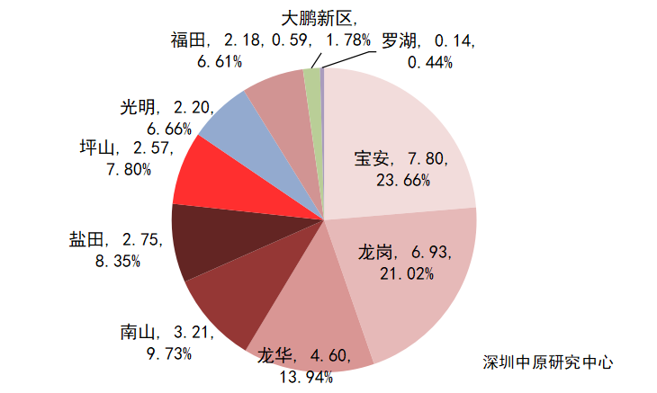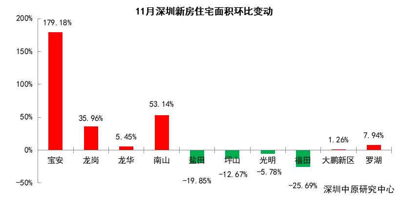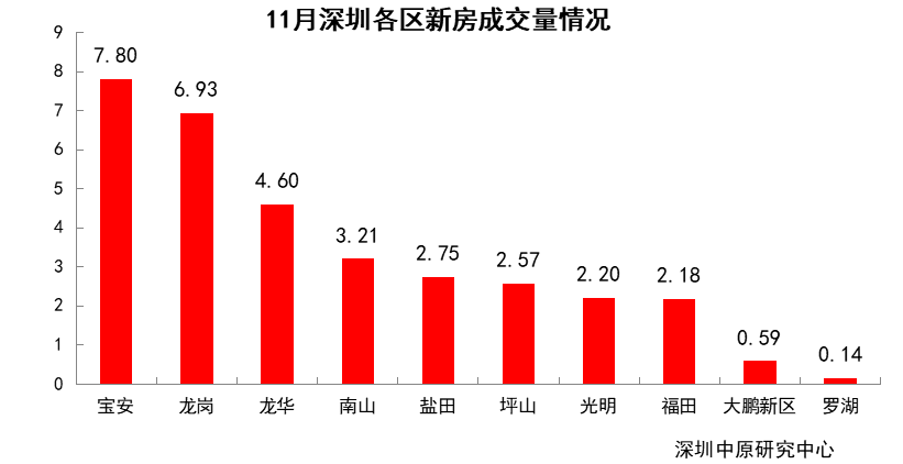 从各区成交面积来看,11月受卓越中寰等项目备案影响,宝安成交面积为7.80万平,占全市成交的23.66%。龙岗和龙华分别以6.93万平和4.60万平的成交面积位居第二和第三。