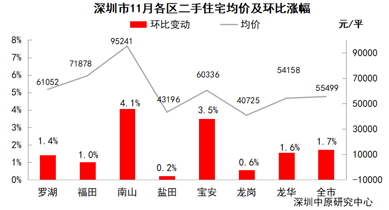 11月全市二手住宅均价为55499元/㎡,环比上升1.7%;各区来看,七区均价均有所上升。受今年政策影响,南山、宝安利好较多,价格上升幅度也相对较大。南山区均价95241元/㎡,环比上升4.1%,涨幅最大;盐田均价43196元/㎡,环比上升0.6%,升幅最小。