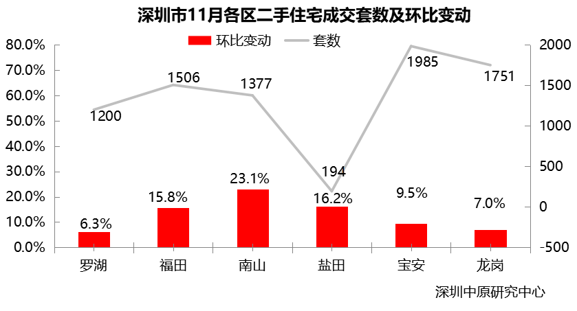分区来看,各区成交量均有上升。其中,南山区成交1377套,环比上升23.1%,升幅最大;而罗湖区成交1200套,环比上升6.3%,升幅最小。宝安成交1985套,继续刷新年内新高,连续四个月成为成交最热区域。