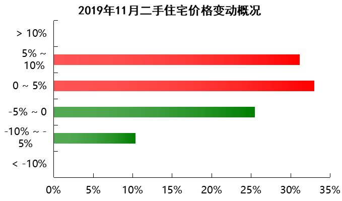 从样本房源的涨跌区间上来看,11月豪宅标准调整,市场继续升温,上涨房源占据主导,占比达到64%。其中,涨幅在0%-5%的占比达到33%;涨幅在5%-10%的占比也达到31%。