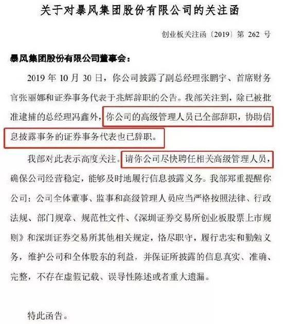 10月31日,深交所紧急向暴风集团下发关注函,称暴风集团除已被批准逮捕的总经理冯鑫外,公司的高级管理人员已全部辞职,协助信息披露事务的证券事务代表也已辞职。