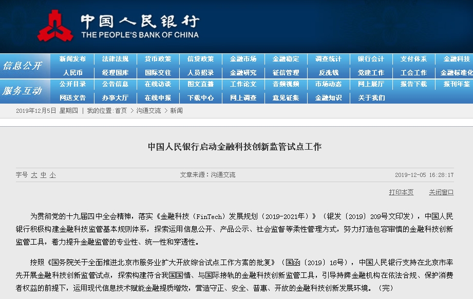 為貫徹黨的十九屆四中全會精神,落實《金融科技(FinTech)發展規劃(2019-2021年)》(銀發〔2019〕209號文印發),中國人民銀行積極構建金融科技監管基本規則體系,探索運用信息公開、產品公示、社會監督等柔性管理方式,努力打造包容審慎的金融科技創新監管工具,著力提升金融監管的專業性、統一性和穿透性。
