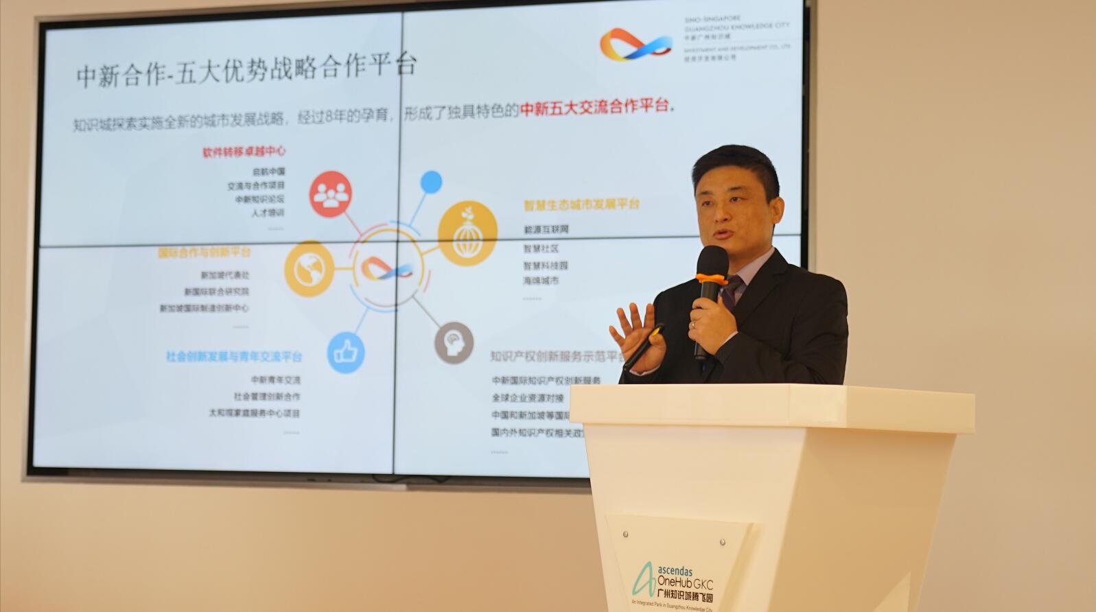 徐晖代表中新广州知识城合作事务办公室向与会嘉宾发出邀请,希望各专家、企业家能将知识城能作为未来发展的归宿地。知识城将用最好的服务、最佳的环境,为各位提供全方位、全过程、全天候的贴身服务,让各位专家、企业家在知识城安心创业、放心投资、舒心发展。