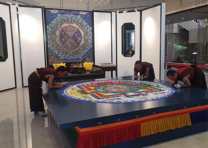 在活動現場,壇城沙畫的現場製作格外引人注目。“一沙一世界,一葉一菩提”——壇城沙畫的過程仿佛一場視覺的盛宴。據了解,壇城是指對一座宮殿一個世界的泛義,用珍貴珊瑚、瑪瑙、綠松石等礦物質研磨成粉,落沙即成畫,畫面立體生動,壇城展示了高度的藝術魅力和視覺觀感。