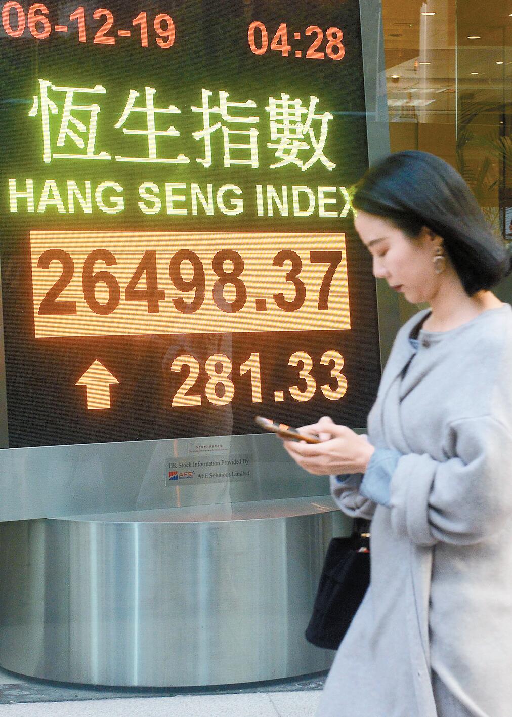 50隻藍籌當中,多達45隻昨日上升。由於市場憧憬中美能夠達成貿易協議,使到避險情緒降溫,公用股昨日明顯跑輸大市。中華煤氣(003)昨跌0.27%,收報14.8元;中電控股(002)昨日無升跌,收報79.75元。重磅股騰訊控股(700)升1.7%,收報335.6元,而且成交金額達52.39億元,超過排第二的阿里巴巴(9988)近四成。
