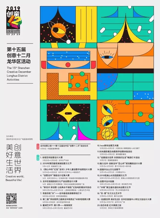 本屆龍華區「創意十二月」活動主題是「創意世界美好生活」,立足創新引領、融合發展,發現、展示龍華文化創意、產業創新的最新成果,將舉辦「1+20」系列活動,即一場創意之夜的主活動以及二十場子活動,涵蓋「創意+傳統」「創意+旅遊」「創意+紅色」「創意+公益」「創意+音樂」等方面內容,涉及多個不同領域,凸顯設計元素,展現傳統品牌的新成果和各類新興業態的魅力。