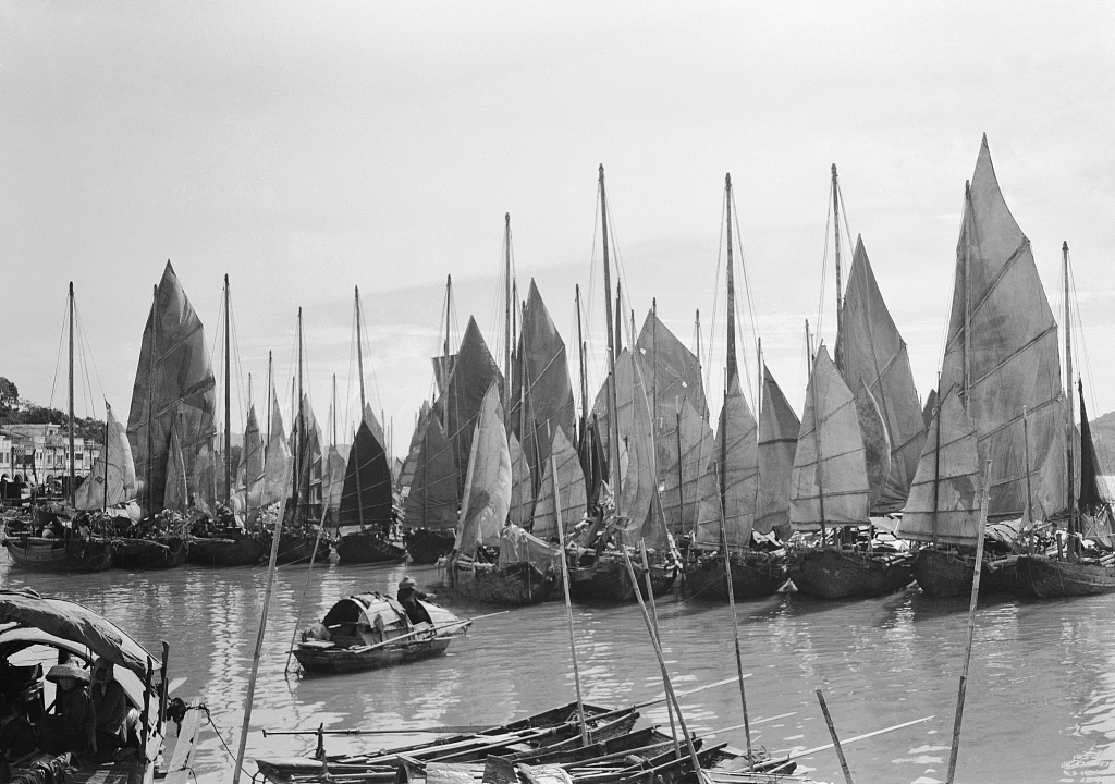 澳门以前是个小渔村,盛产蚝,蚝壳内壁光亮如镜,澳门因此被称为蚝镜。后人把这个名称改为较文雅的“濠镜”。从这个名称中,又引申出濠江、海镜、镜海等一连串澳门的别名。图为1955年10月4日,澳门,港口的渔船。