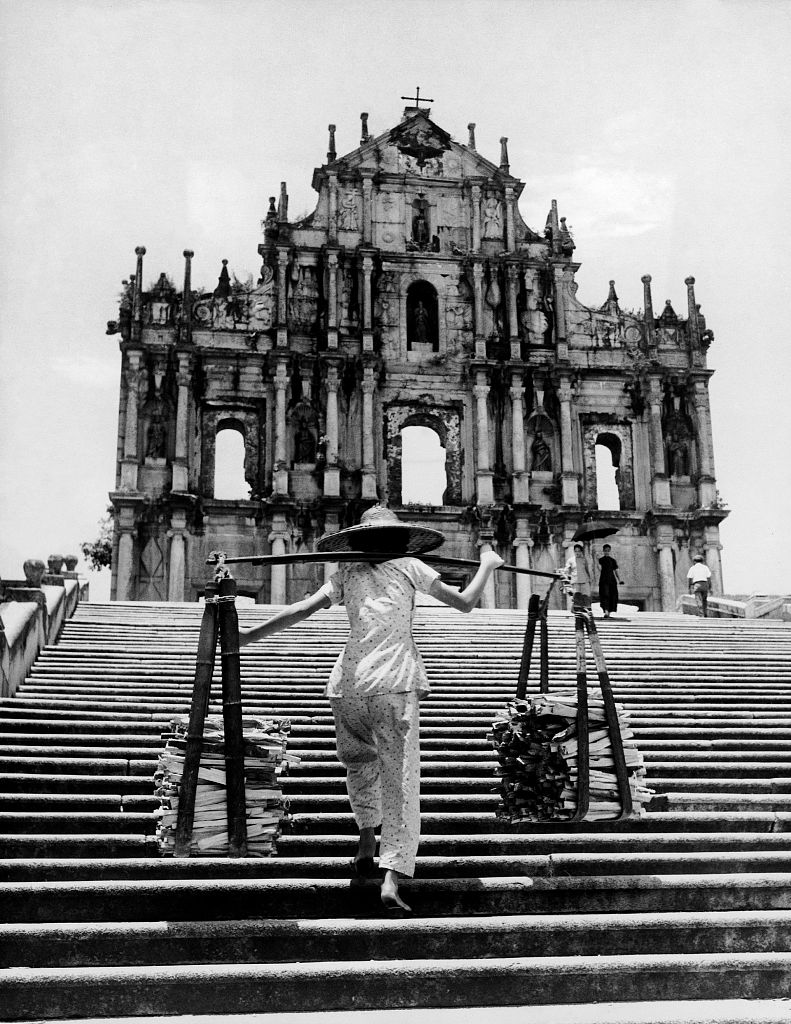 约1953年,澳门,大三八牌坊,也就是圣保罗大教堂遗址的前壁。大三巴牌坊是澳门最具代表性的名胜古迹,1580年葡萄牙人在澳门建起了这座教堂,取名“圣保禄”教堂。后来,教堂两次毁于火灾。只剩下耗资3万两白银的前壁,这就成了今天的大三巴牌坊。教堂成为遗址之后,因前壁与中国传统牌坊相似,加上“圣保禄”从葡文音译成中文,说成“三巴”,才有大三巴牌坊的称谓。