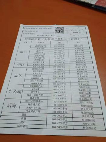 从记者近日拿到的一张招租传单来看,深圳南山、福田车公庙等区域的写字楼价格,大部分在每月100元/平方米以下,最低到了49元/平方米。其中,位于福田车公庙的NEO大厦,租金是108元/平方米起,南山后海的中洲控股中心的价格则是128元/平方米起。