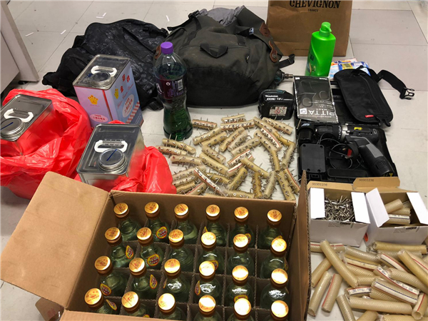 警方在上水天平邨拘捕師生等多人,並搜出大批白電油及裝上鐵釘的膠水管等物品。