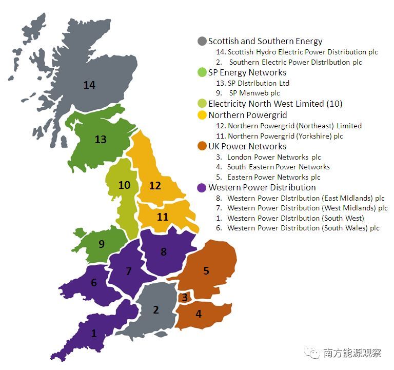 而六大能源巨头也控股着14家取得许可证的配电网运营商DNOs,运行着14个供电区的配电网。在这14家DNOs覆盖的区域内,还有一些独立配电网运营商IDNO运营着自己的小型配电网络。