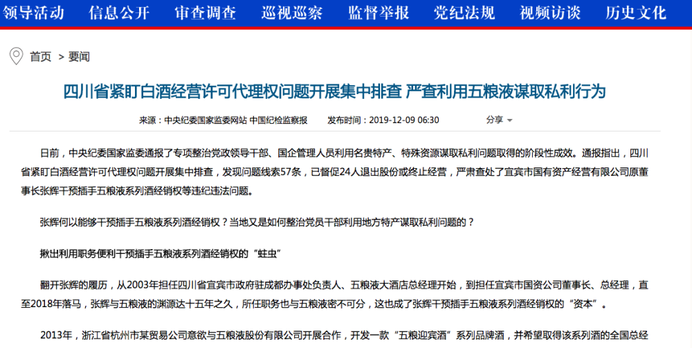 南都讯 记者马建忠 “接棒”贵州茅台,五粮液在白酒经营许可权上也“出事”了!12月9日,中央纪委国家监委网站发出《四川省紧盯白酒经营许可代理权问题开展集中排查 严查利用五粮液谋取私利行为》的通报,通报指出,四川省紧盯白酒经营许可代理权问题开展集中排查,发现问题线索57条,已督促24人退出股份或终止经营,严肃查处了宜宾市国有资产经营有限公司原董事长张辉干预插手五粮液系列酒经销权等违纪违法问题。