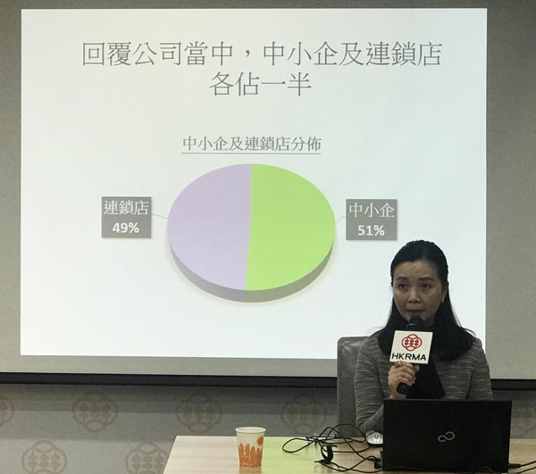 另外,有11%回覆公司表示將於6個月內採取「結束營業」措施,如以現時全港6.4萬間以營業執照計的零售機構,即未來將可能有7000間零售公司結業。部分公司表示,即使未到結業程度,但預期未來6個月將會減少店舖數目,16%中小企料減少50%店舖數目;49%的連鎖店表示將減少10%至20%的店舖數目。