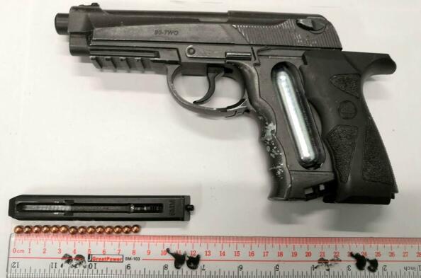 據了解,涉事氣槍型號是WG 90-TWO全金屬CO2直壓手槍,採用鋁合金製成,非常堅硬,可發射六毫米BB彈,火力超出二點五焦耳,可打凹鋁板,若射中人體可以致傷,售價約700港元,在台灣及海外網站均有發售。