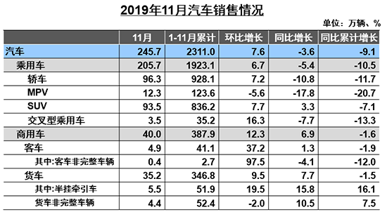 1-11月,国内汽车产销分别完成2303.8万辆和2311万辆,产销量同比分别下降9%和9.1%,降幅较1-10月分别收窄1.4和0.6个百分点。陈士华表示,今年车市下滑如此严重,主要还是受到“国六”标准实施的影响。此外,国内经济增速不断回落,消费者购买欲下降,以及国际市场复杂的环境也不利于汽车行业的发展。