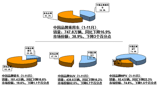 分国别来看,11月自主品牌乘用车销量为80.6万辆,同比下降11.4%,市场份额39.2%,同比下降2.7个百分点;1-11月,自主品牌乘用车共销售747.8万辆,同比下降16.9%,市场份额38.9%,同比下降3个百分点。其中自主品牌轿车、SUV和MPV市场占有率分别为19.6%、52.5%和74.8%,较去年同期分别下降1.1个百分点、5.7个百分点和1.5个百分点。陈士华表示,“作为我们关注的重点,中国品牌乘用车市场占比曾在8-10月出现上升趋势,本月再次出现下滑显然不是一个好现象。”