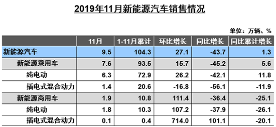1-11月,新能源汽车产销分别完成109.3万辆和104.3万辆,同比分别增长3.6%和1.3%。其中纯电动汽车产销分别完成89.1万辆和83.2万辆,同比分别增长10.3%和5.2%;插电式混合动力汽车产销分别完成20.1万辆和21万辆,同比分别下降18.7%和12.1%;燃料电池汽车产销分别完成1426辆和1337辆,同比分别增长398.6%和375.8%。陈士华表示,经过连续5个月同比下滑,新能源累计产销量同比仅实现微弱增长,全年或呈现负增长。