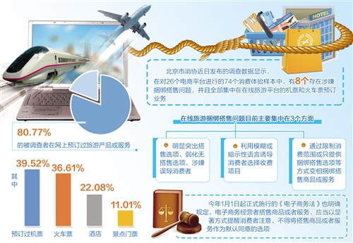 日前,北京市消费者协会发布的《互联网消费捆绑搭售问题调查报告》显示,《电子商务法》实施后,仍有少数平台企业以更隐蔽的方式捆绑搭售商品或服务,在线旅游平台的机票、火车票预订,景区门票预订成为“重灾区”。