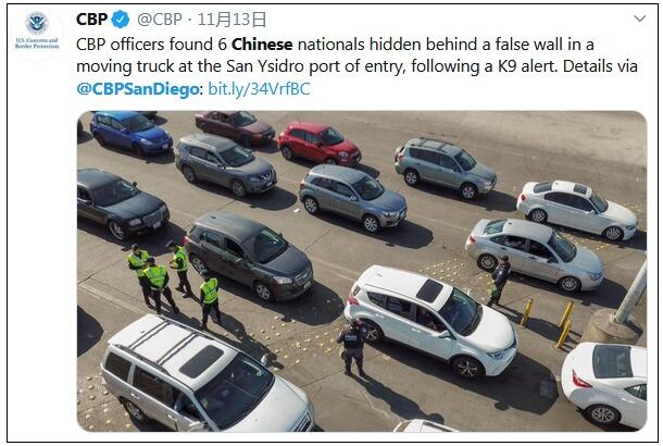 圣伊西德罗位于美国加利福尼亚州圣迭戈市的美墨边境线地区。同样是在这一口岸,CBP还在11月7日发现有6名中国公民试图藏在一辆卡车里企图偷渡。