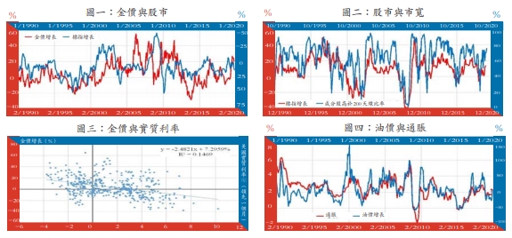 另外,若資金放在銀行存款或無風險的國債能穩取的利息減少下,持有黃金自然相對吸引,因此金價走勢可參考利率前景。圖三顯示,實質利率與黃金增長呈反比,前者只領先後者一個月。要測實質利率,可參考通脹去向。