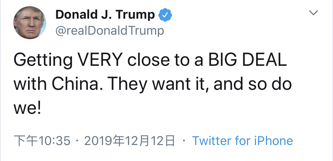 特朗普在推特上表示:非常接近与中国达成一个大协议。 他们想要协议,我们也是!