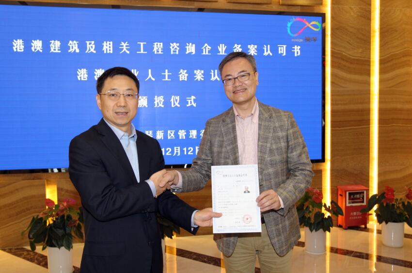 當日上午,橫琴新區管理委員會主任楊川和黨委副書記李偉輝在橫琴新區綜合服務中心現場,分別為首批港澳建築專業人士、港澳企業頒授了《備案認可書》。同時具有香港和澳門註冊執業資格的余偉清,來自澳門的冼偉雄、周子鍵,喜獲首批港澳專業人士備案認可書。來自澳門的澳馬建築工程有限公司、栢傑工程顧問有限公司,分別作為澳門施工企業和工程顧問公司獲首批港澳企業備案認可書。