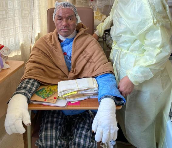 祥哥说,现在身体的伤处平时不碰就不太痛,但周身的伤处很痒又不能碰,手上的皮肤感觉又硬又紧绷,手指也不能动,有些担心以后的活动能力。而每次换纱布就像煎了一层皮,非常痛,希望可以快点好,可以快些回家。