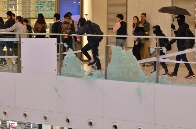 太古城商場昨有黑衣人擊碎玻璃圍欄。