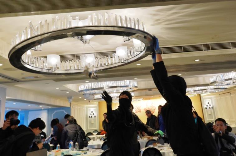 黑衣人破壞太古城內一食肆的燈飾。
