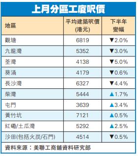 若按區域區分,下半年有六區的工廈呎價均錄得下跌,其中荃灣區的跌幅最大,較6月份的呎價累跌約5%,11月份的呎價最新報4138元。而長沙灣、九龍灣及觀塘的工廈呎價分別為6327、5352及6819元,分別錄4.4%、3%及2%的跌幅。另外,屯門是升幅最大的地區,也是十區之中呎價最低,11月份工廈呎價為3639元,下半年累升3.4%。