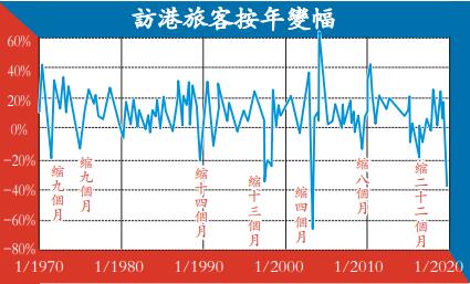 訪港旅客數字上網取得的僅十年,但其實自1970年有統計月刊起已有記載。固然,坊間不會有多少人有耐性將整體數據整理繪出,今文就有了。歷來嚴重收縮的,有1973、1975年兩次石油危機,1989年,1997年金融風暴,2003年沙士,2009年金融海嘯後,2016年新興市場危機後,和今次。論最差月份的按年收縮幅度,最新9月份數字仍未及沙士時的兩個月般差,但若計及上月則難料矣,看來還很有機會破底。