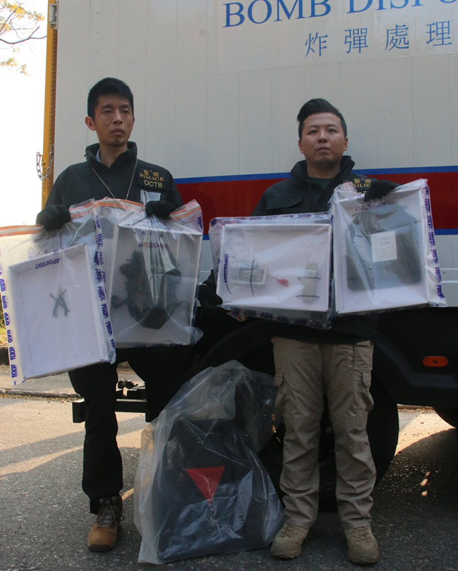 警方日前搗破試爆遙控炸彈案後展示證物。