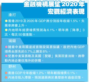 香港方面,雖然今年下半年本港受修例風波及大型社會衝突影響,但觀乎今年的股票、債券等市場仍運作正常及健康,當中如阿里巴巴上個月重回香港第二上市順利,並成為港股史上第三大IPO。金弘毅續指,本港金融市場與國際大環境及中國經濟發展更為靠近及相關,並非忽視本地政局因素,對本港明年經濟持審慎樂觀態度。