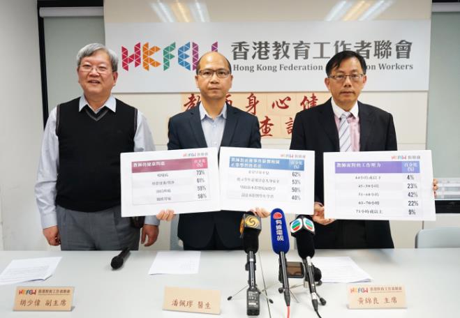 教聯會於11月底進行一項調查,成功訪問了850位中小學、幼稚園及特殊學校老師,調查發現,受訪教師中七成三每周工作超過51小時或以上,高工時即每周工作61小時或以上的教師比例由去年三成九,下降至今年三成一,但絕大部分教師表示過去一周曾出現負面情緒,依次為疲乏、洩氣及焦急,分別達八成半、五成四及四成二,如以0至10分自評工作的快樂程度,今年教師的平均分達5.25,較去年的4.97分有所改善;不過仍屬僅僅合格,尚有不少改善的空間。