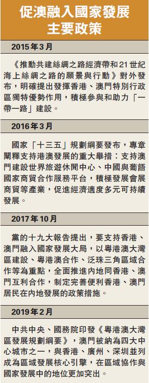「抓住機遇、乘勢而為,在融入國家發展大局中拓展發展空間、培育發展新動能」「推動經濟適度多元化、可持續發展」「堅持把發展經濟、改善民生放在首位;堅持依法有效施政,把澳門建設得更美、更好、更繁榮」……恰如習主席2015年會見來京述職的崔世安時所說:「中央高度重視澳門的繁榮穩定。」