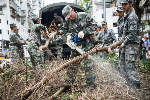 解放军驻澳门部队协助特区政府救助台风“天鸽”灾害,清理被风吹倒的树木(2017年8月27日摄)。新华社发