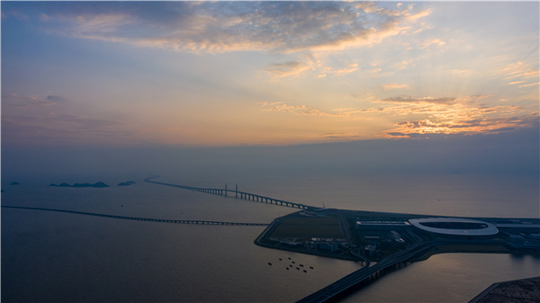 晨曦中的港珠澳大桥珠澳口岸人工岛(10月24日无人机拍摄)。新华社