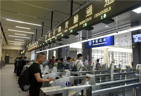 在港珠澳大桥澳门边检大楼,旅客从自助查验通道通关去往广东珠海(11月21日摄)。新华社