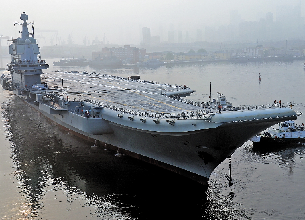 「山東艦」完成首次海上試驗任務,返抵大連造船廠碼頭(5月18日攝)。 資料圖