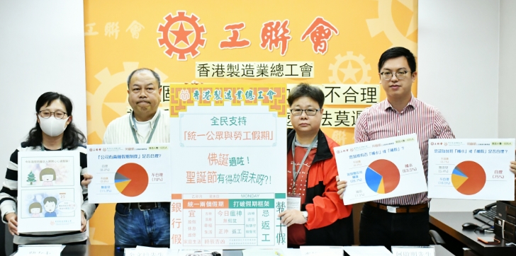 總工會主席李煒敏表示,臨近聖誕節,但聖誕假期不是全港所有上班族都可享有,一般製造業僱員大都只可放取12日「勞工假」,卻未能享有17日「銀行假」。調查顯示,六成半受訪者只可放取「勞工假」,逾半公司並存「勞工假」及「銀行假」兩種假期制度,九成三受訪者支持立法規定全港僱員每年同享假期17日。他批評,兩種假期制度並存的安排十分過時,而且會對香港僱員造成分化及不公平現象,同時亦與政府目前力推的「家庭友善政策」理念相違背。