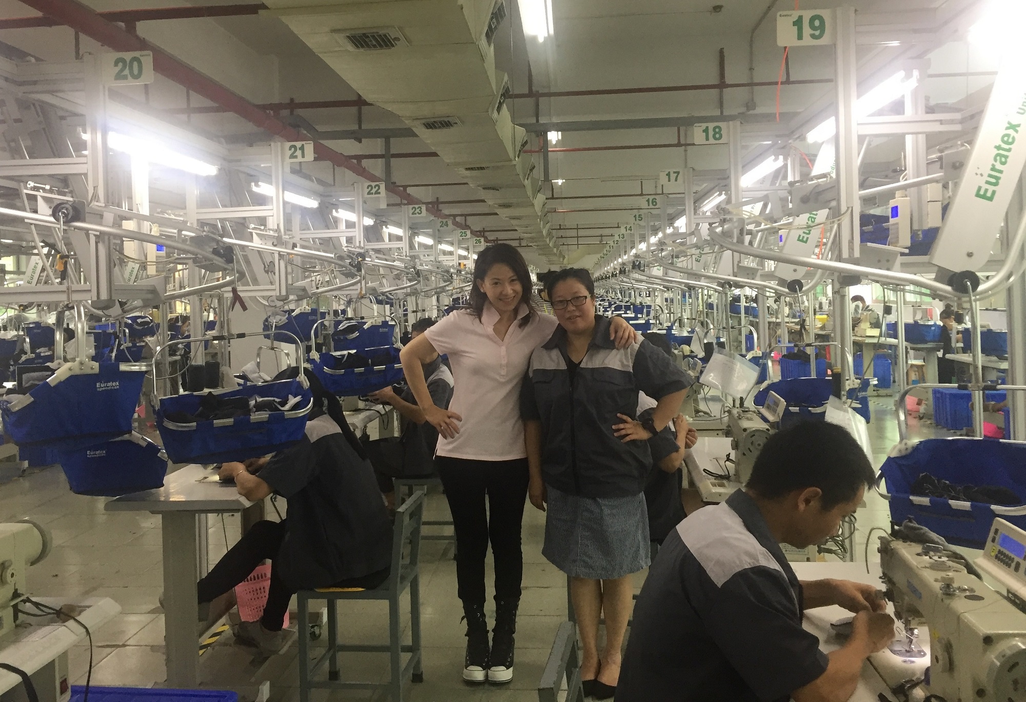 林曉盈與工廠員工打成一片。(車間配備了目前製衣行業最先進的吊掛系統Euratex Hanger System)