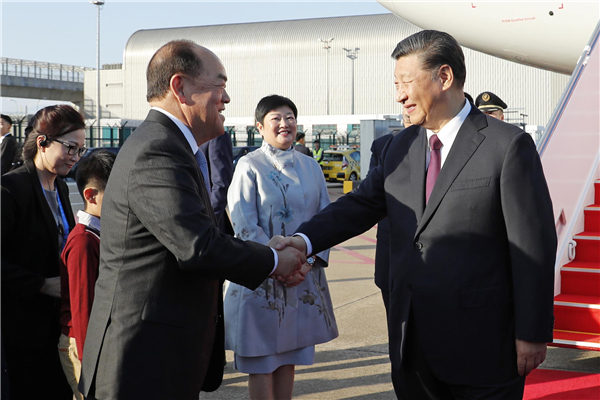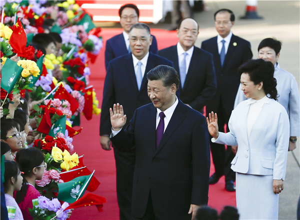 昨午4時許,習近平乘坐的專機徐徐降落在澳門國際機場。習近平和夫人彭麗媛走出艙門,向歡迎人群揮手致意。澳門警察樂隊奏響熱情喜慶的歡迎曲,現場一片歡騰。舷梯旁,兩名澳門少年兒童向習近平和彭麗媛獻上鮮花。在澳門特別行政區行政長官崔世安和夫人霍慧芬陪同下,習近平和彭麗媛同前來迎接的人員親切握手。數百名澳門青少年和各界群眾代表揮動國旗、特別行政區區旗和鮮花,熱烈歡迎習近平的到來。