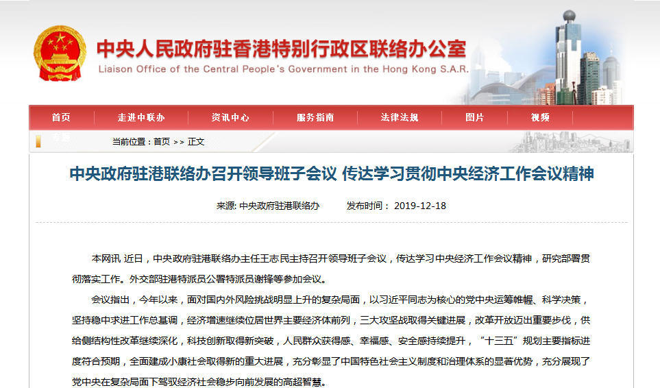 【香港商報网訊】據中聯辦網訊:近日,中央政府駐港聯絡辦主任王志民主持召開領導班子會議,傳達學習中央經濟工作會議精神,研究部署貫徹落實工作。外交部駐港特派員公署特派員謝鋒等參加會議。