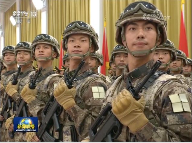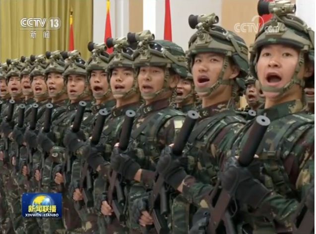 “同志们好!”“主席好!”“同志们辛苦了!”“为人民服务!”习近平亲切问候受阅官兵,官兵们响亮作答。
