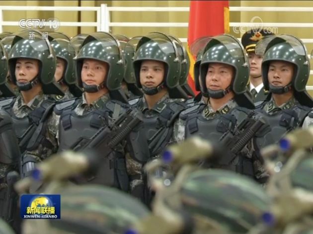 20日,在雄壮的阅兵曲中,习近平依次检阅了仪仗方队、防卫作战方队、防暴行动方队、反恐行动方队、应急救援方队。