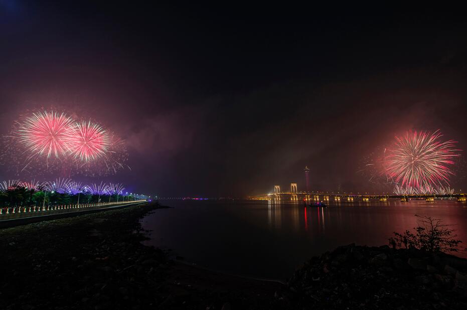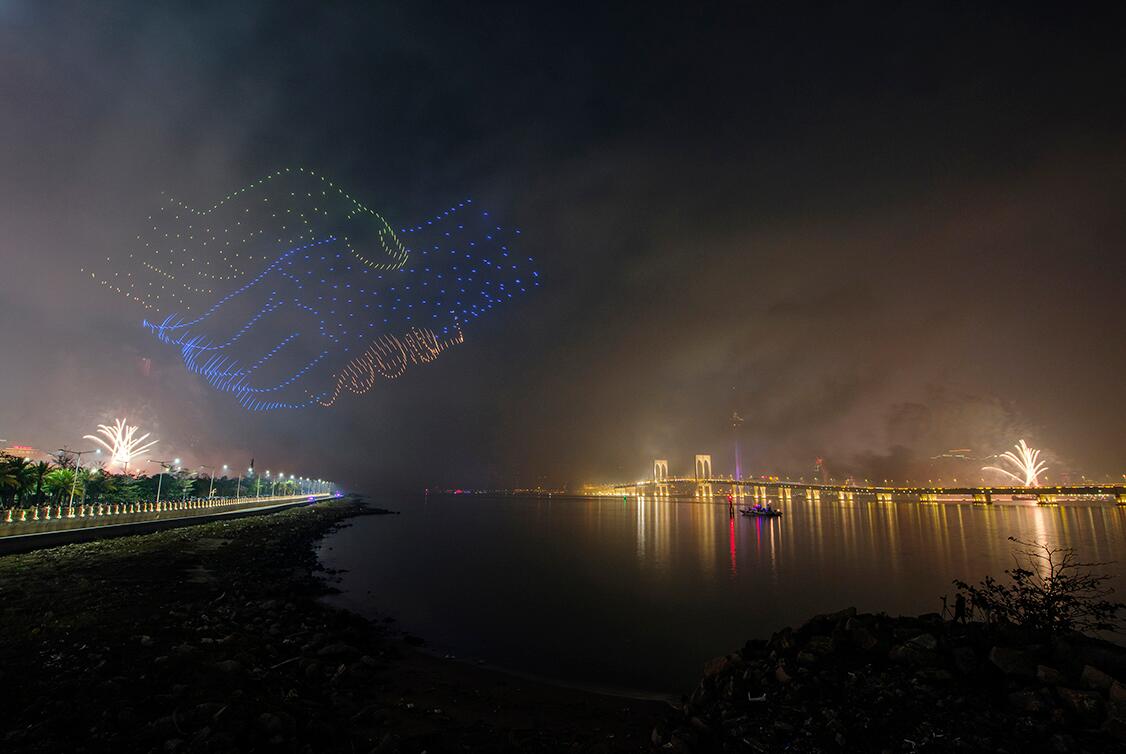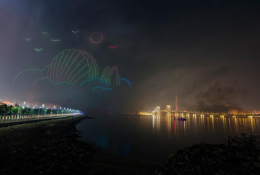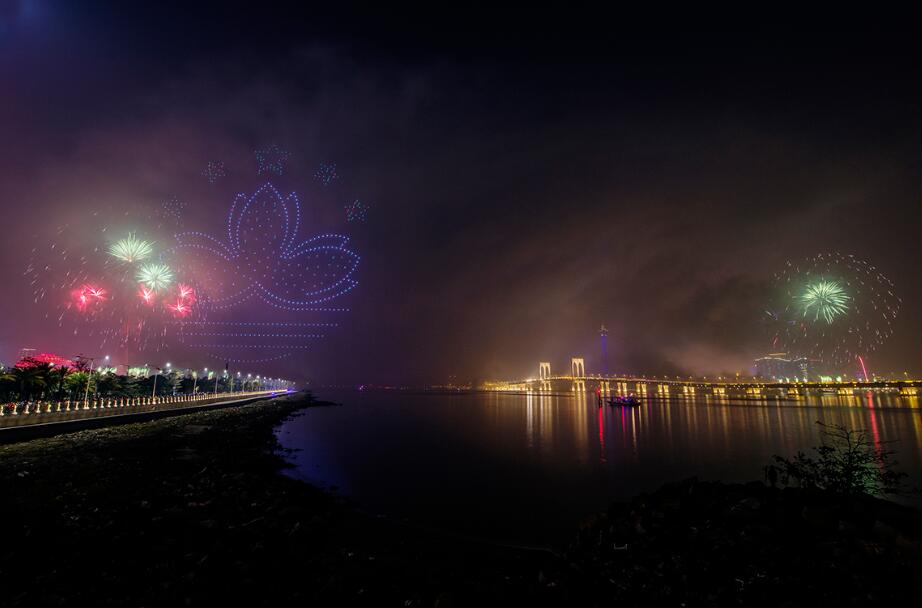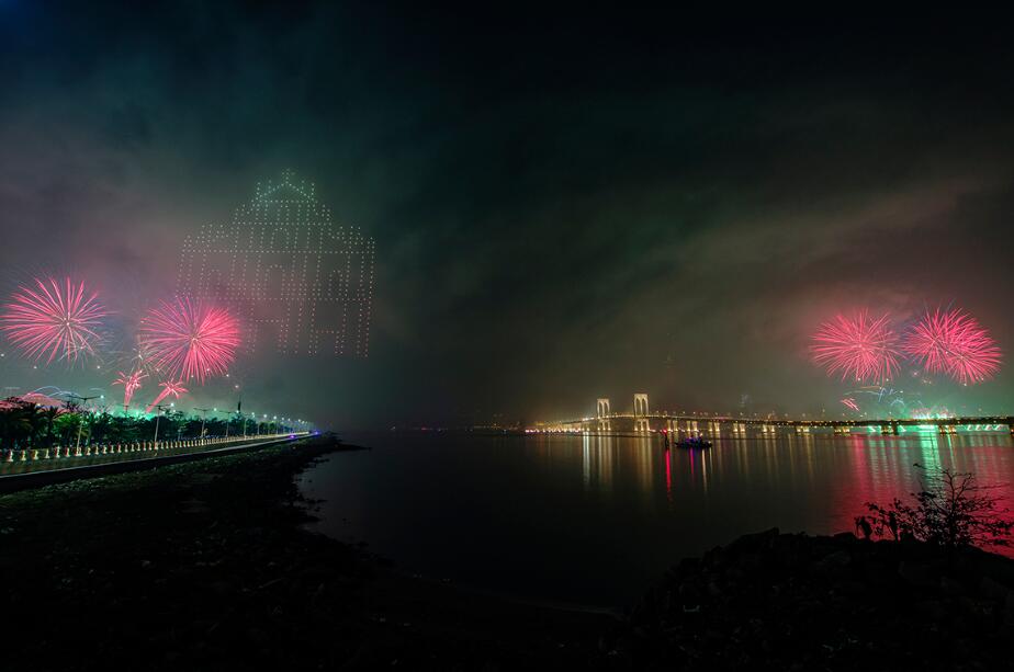 整場煙花匯演章節主題鮮明、編排有序、層層遞進,期間既有各自綻放的華麗瞬間,又有兩地齊放的驚艷互動;此外,56艘無人船及600架無人機組成立體編隊參演,結合激光、燈光、音樂等表演形式,將光影藝術和前沿科技完美融合,精心呈獻一場壯麗璀璨、形式新穎、觸動人心的感官盛宴。